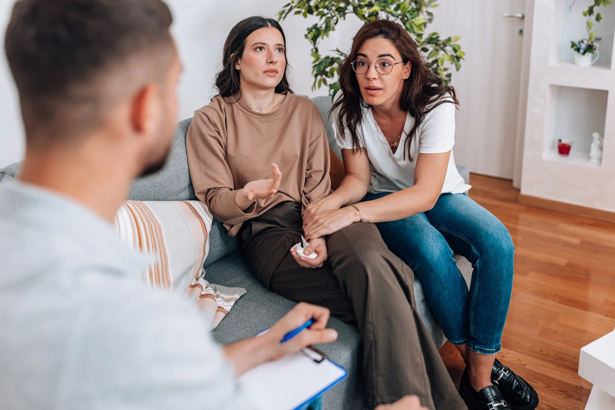 Reigniting intimacy through therapy. A transformative moment as two women engage in relationship therapy. One partner, with brown skin, leans towards their therapist, maintaining eye contact, while tenderly hold her partner’s arm. The other, with fair skin, thoughtfully processes the insights gain during session.